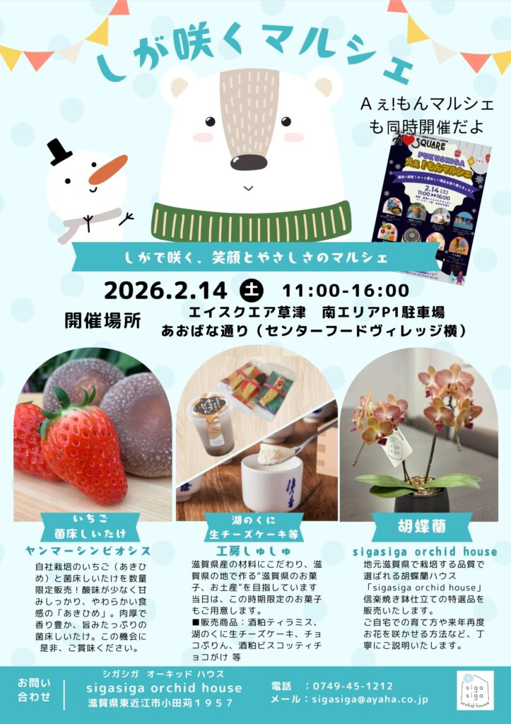 今週末、2月14日(土)のバレンタインデーは、エイスクエア草津で開催される「しが咲くマルシェ」にお邪魔します。